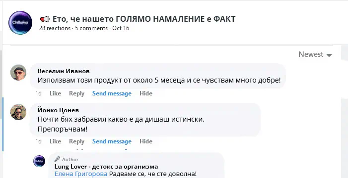 "Продължавам да пия LungLover - ползвам го като ускорител за белодробната детоксикация и за превенция срещу мръсния въздух – и се чувствам все по-добре с всеки изминал ден. Преди кашлях нощем и това ме будеше, понякога направо ми потичаха сълзи от хриповете... След 2 месеца прием на LungLover кашлицата намаля и почти изчезна и усещам как мога да си поема въздух докрай.”